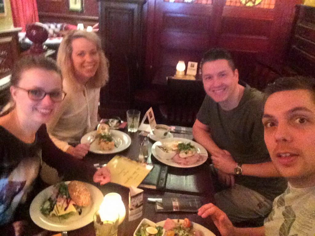 Na een teamfoto stappen we weer bij Raoul in de auto en vertrekken we richting Emmen. Hier parkeren we nabij het centrum en lopen vervolgens richting het plein bij het oude Noorderdierenpark. Omdat we aan de vroege kant zijn gaan we kort voor een hapje en een drankje naar de chique tent Drommedaar. Twintig minuutje later keren we weer terug bij de buren van Emmen Escapes.